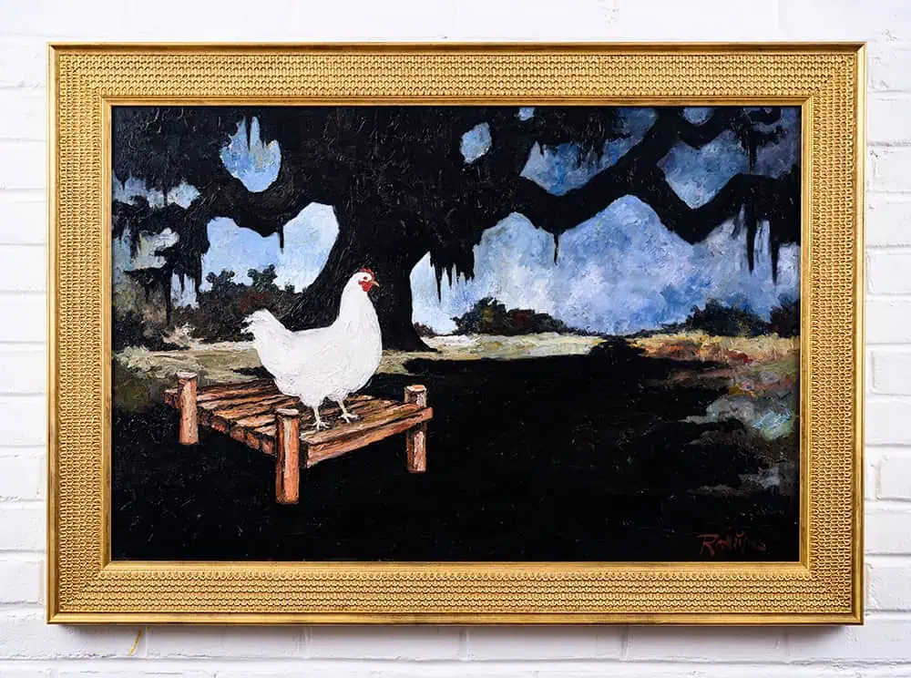 George Rodrigue began his career by portraying on his canvas the Cajuns of South Louisiana and what he feared was his dying heritage – including its oak trees, people, traditions, and mythology. He sought to “graphically interpret the Cajun culture,” preserving it in the face of a progressive world.