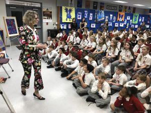 Coinciding with the event, as part of the George Rodrigue Life & Legacy Tour, Wendy Rodrigue, the artist’s widow, gave multiple lectures which included all students at Catholic High. Wendy shared original art from her personal collection, and shared animated personal stories from the inspiring history of New Iberia’s artist.