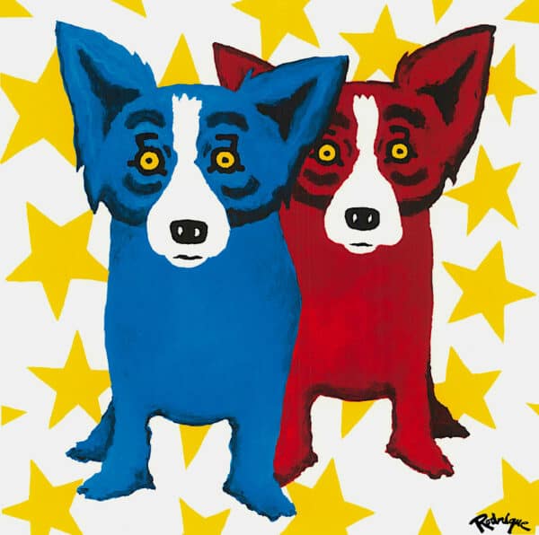 This print shows the Blue Dog with its alter ego, the Red Dog surrounded by bright, yellow stars. The work highlights Rodrigue’s eye for composition and design. Instead of painting perfectly whole stars around the dogs, Rodrigue infuses the work with visual interest by creating the illusion that the dogs have been placed atop an existing plane of stars. Parts and portions of stars poke out from behind the dogs creating a balance between negative and positive space within the work. The yellow stars accent the yellow in the dogs’ eyes and highlight the fact that the work is composed mainly of the three primary colors.